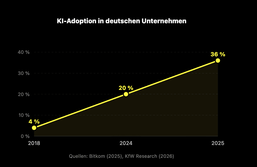 36 % der Unternehmen ab 20 Beschäftigten nutzen KI – fast doppelt so viele wie im Vorjahr. Nur noch 17 % halten KI für irrelevant, gegenüber 41 % ein Jahr zuvor (Bitkom, 2025). Laut KfW Research setzen inzwischen rund 780.000 Mittelständler künstliche Intelligenz ein – eine Verfünffachung seit 2018 (KfW, 2026).