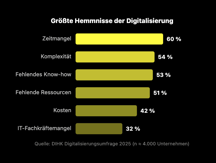 Denn gleichzeitig geben 53 % der Unternehmen an, Schwierigkeiten mit der Digitalisierung zu haben (Bitkom, 2025). Die DIHK-Umfrage zeigt warum: Zeitmangel, Komplexität und fehlende Ressourcen bremsen die Umsetzung massiv.