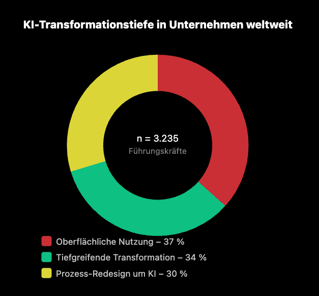 37 % der Unternehmen nutzen KI nur oberflächlich – ein Tool hier, eine Automatisierung dort. Ohne Prozessanpassung. Ohne strategische Einbettung. Die Technologie ist da, aber die Wirkung bleibt aus.